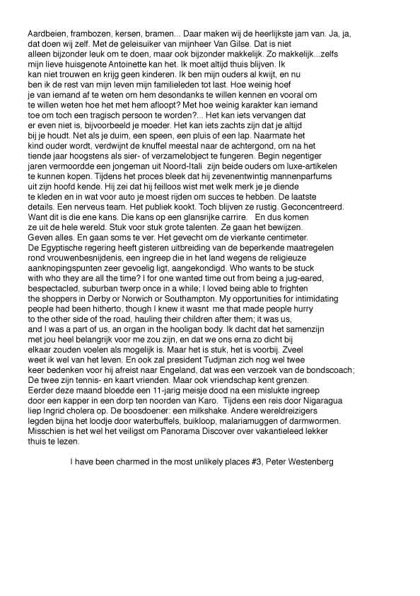 | > Binnen deze tekst treedt een vervreemding op omdat er geen sprake is van een eenduidige codering, de tekst als geheel is niet te categoriseren als verslaggevend, informatief, poëtisch of adverterend. | |||||