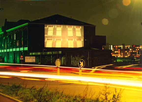 > Het Wilhelminagebouw, op dit moment nog in gebruik als woon- en werkruimte voor kunstenaars, werd getransformeerd tot een weemoedige vooruitblik op wat komen gaat. >