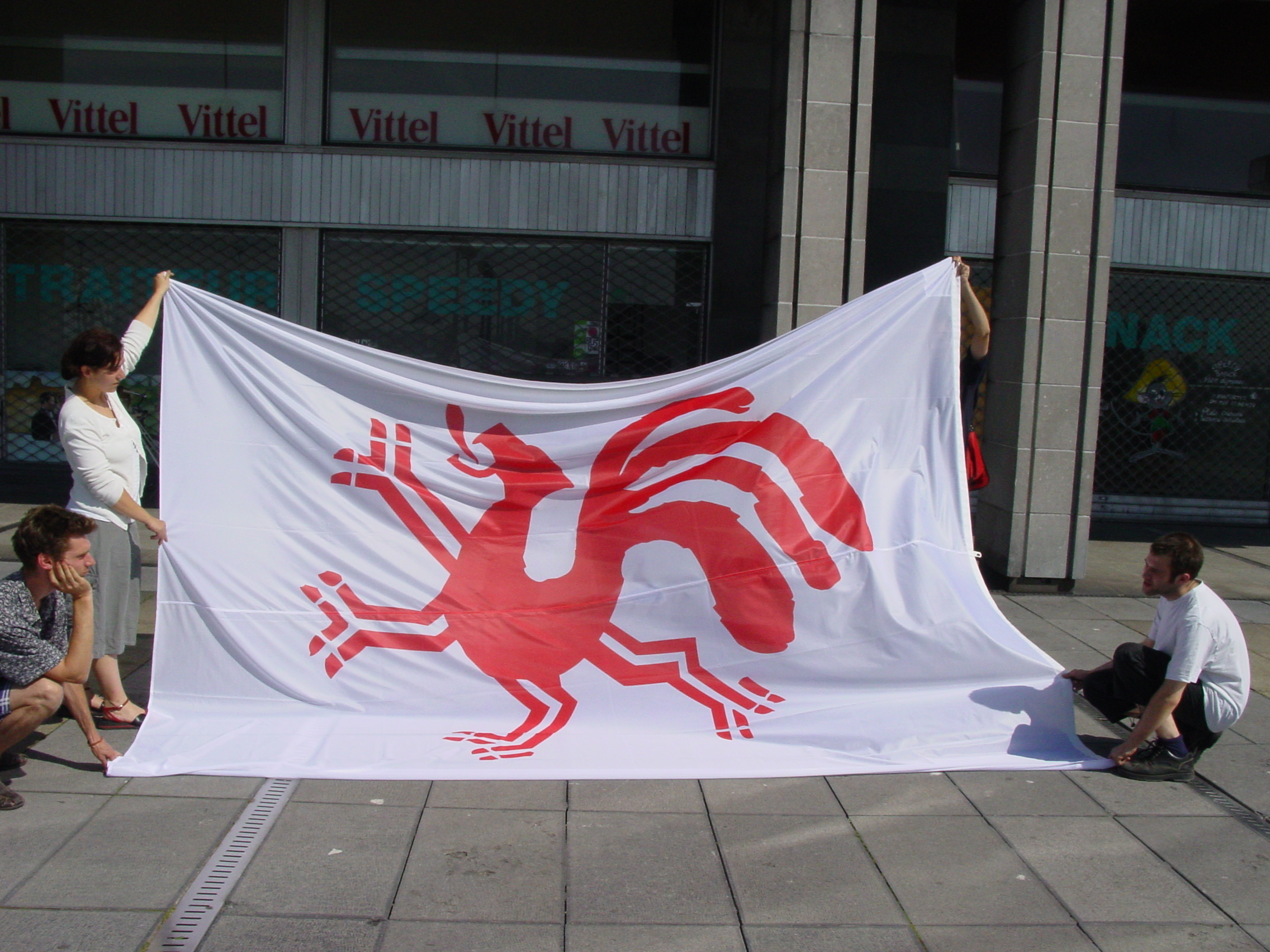 The logo hybridises lion and rooster, icons of the Dutch- and French speaking communities in Belgium. The flag was made as a hommage to the inter-communal city of Brussels; a city where cultures meet, swap, join and evolve.